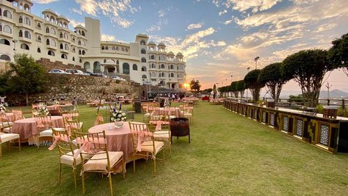 Bhairavgarh Palace is a peaceful hilltop resort in Udaipur with a royal touch. It is known for its quiet surroundings, clean rooms and beautiful views of the city and nature. The property is perfect for couples who want an intimate or mid-sized wedding in a calm location. With tasteful décor and open spaces, the palace offers a lovely setting for celebrations, photos and family gatherings.