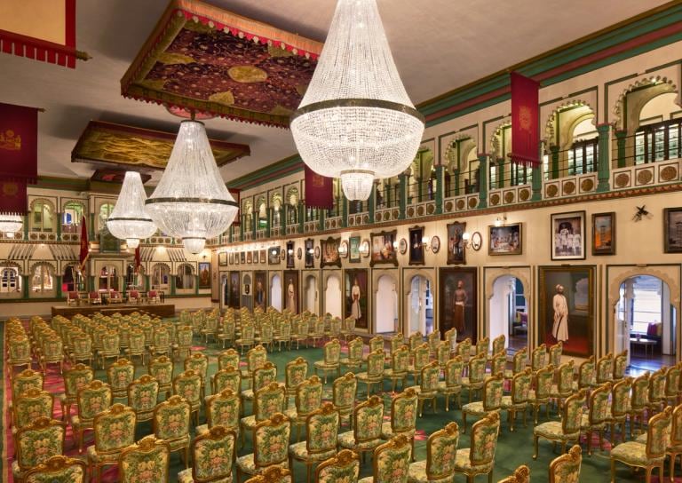 The palace has grand banquet halls and spacious lakeside lawns that are perfect for weddings and receptions. The famous Durbar Hall and the adjoining Crystal Gallery provide a royal indoor venue, while the outdoor lawns offer lake views that look stunning for pheras, cocktails and sangeet nights. The venue supports weddings with up to around 1000 guests depending on setup.